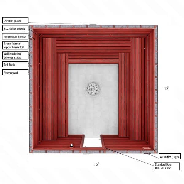 The 12x12x7′ U Custom Indoor Sauna Kit is our most popular sauna kit across Canada. Known for its durability and natural beauty, Western Red Cedar is strong, lightweight, and resistant to warping or shrinking over time. It also provides a comfortable and cooler surface to sit and lean on, enhancing your sauna experience.