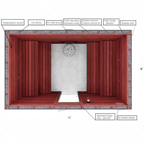 The 6x10x7 S Custom Western Red Cedar Sauna Kit is our most popular sauna kit in Canada. Cedar sauna wood is strong, lightweight, and resistant to warping or shrinking over time. It also provides a cooler and more comfortable surface to sit and lean on.