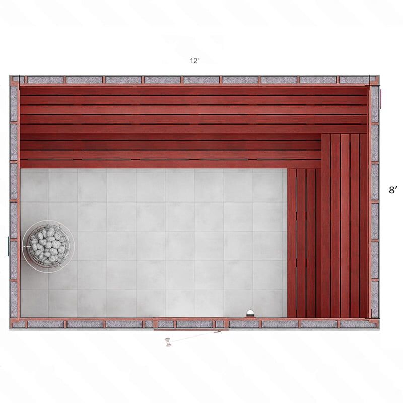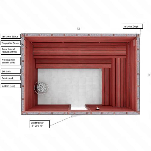 Each sauna kit comes with all the necessary materials for the walls, ceiling, and benches. In a 8x12x7′ Custom Western Red Cedar Sauna Kit, we supply: