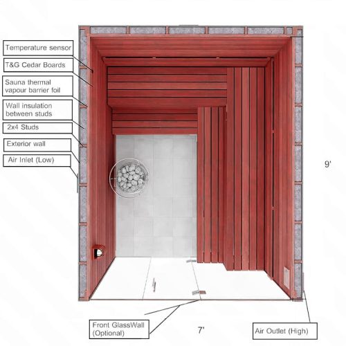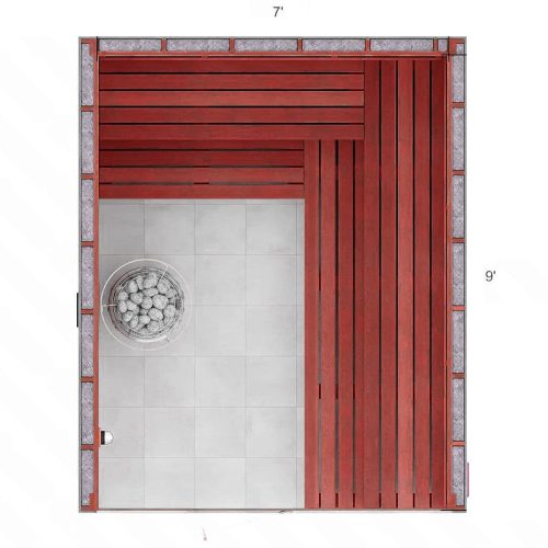 Each sauna kit comes with all the necessary materials for the walls, ceiling, and benches. In a 9x7x7′ Custom Western Red Cedar Sauna Kit, we supply:
