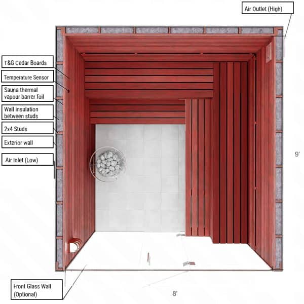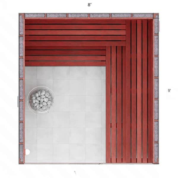 Each sauna kit comes with all the necessary materials for the walls, ceiling, and benches. In a 9x8x7′ Custom Western Red Cedar Sauna Kit, we supply: