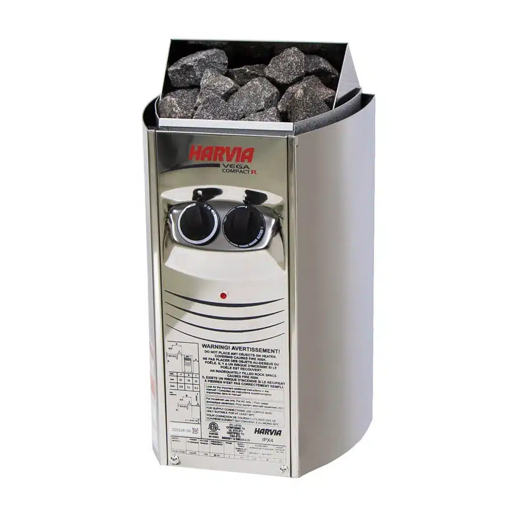 The Harvia Vega Compact 1.9 kW is a space-saving electric sauna heater designed for small home saunas. Despite its size, it delivers efficient, even heat and features ergonomic top-mounted controls for easy use.