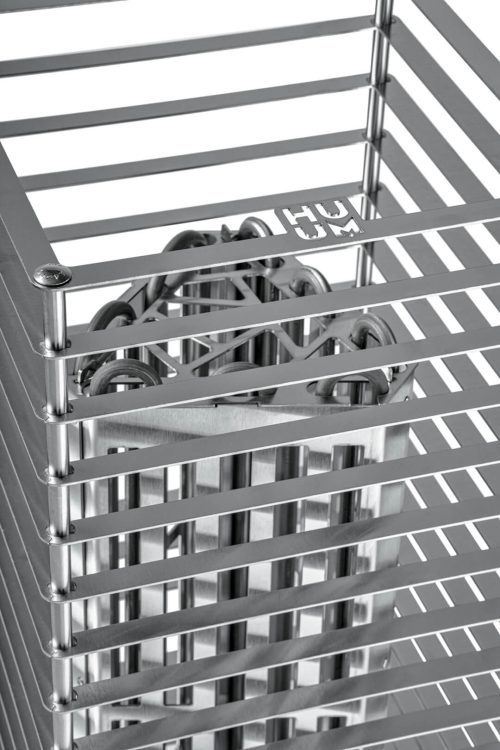 Rather than relying on exposed metal surfaces, the CLIFF focuses on stone-driven heat. With room for approximately 75 kg (165 lb) of sauna stones, it provides sufficient thermal mass to generate steady temperatures and smooth, lingering steam. While its stone capacity is slightly lower than the HUUM Steel, it follows the same design philosophy: controlled airflow paired with high stone volume for balanced heat and steam production.